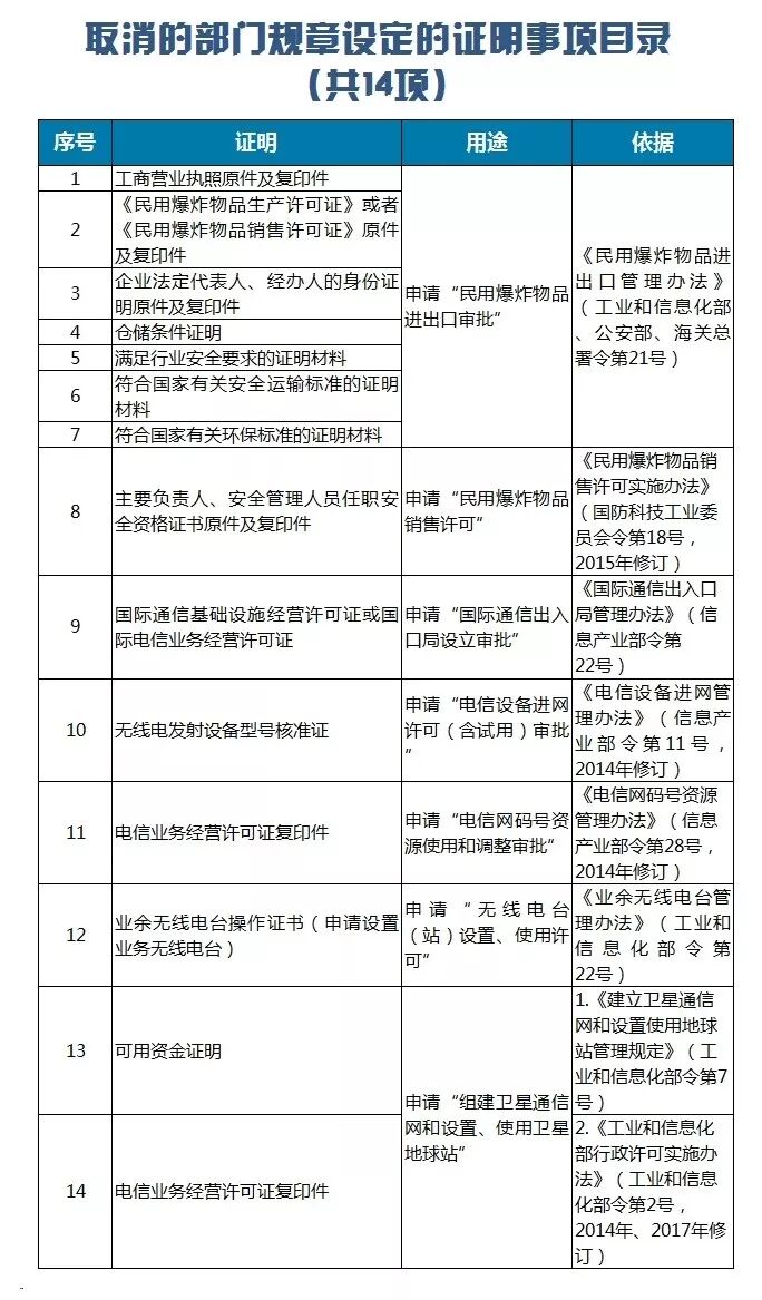 本次取消的证明事项共计两类38项:第一类是部门规章设定的证明事项,包括申请“电信设备进网许可(含试用)审批”涉及的“无线电发射设备型号核准证”等14项,涉及《电信设备进网管理办法》《民用爆炸物品销售许可实施办法》等8件部门规章。第二类是规范性文件等设定的证明事项,包括办理“道路机动车辆生产企业及产品准入许可”涉及的“消防验收证明”等24项,涉及《工业和信息化部关于印发<制造业单项冠军企业培育提升专项实施方案>的通知》《工业和信息化部办公厅关于组织开展2017年度国家级工业设计中心认定工作的通知》等21件文件。 《决定》公布后,工业和信息化部将按照有关规定,组织做好相关部门规章和规范性文件的修订工作,为巩固证明事项清理工作成果提供良好的法治环境。